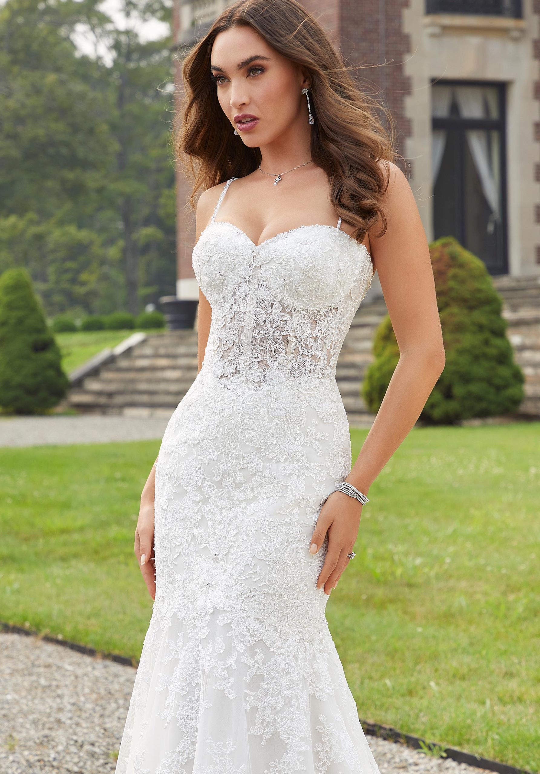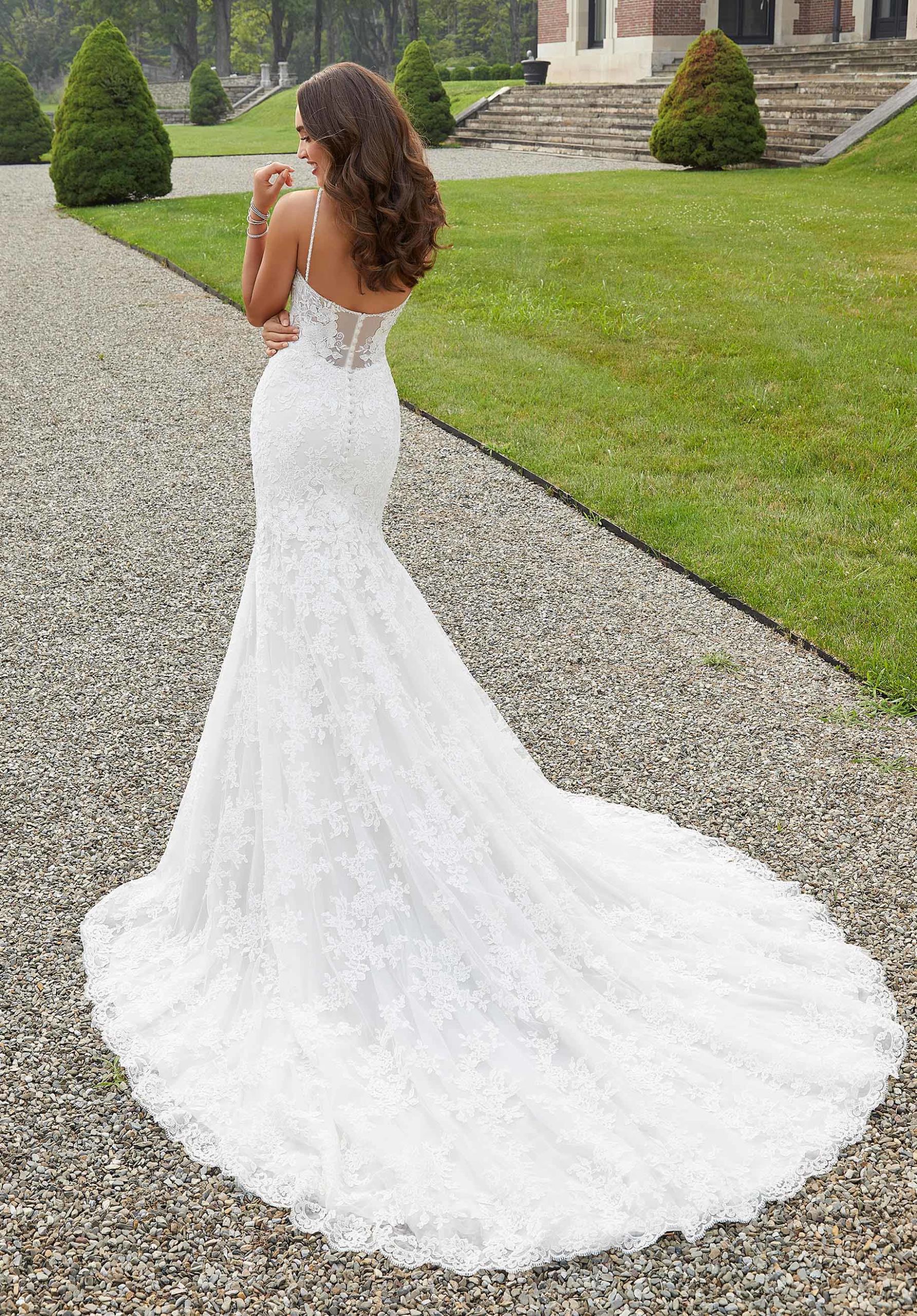 Covered in blooms, this strikingly romantic A-line gown features lacy appliqués over a tulle train.